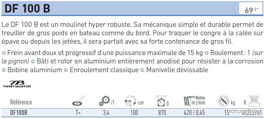 Le DF 100 B est un moulinet hyper robuste. Sa mécanique simple et durable permet de treuiller de gros poids en bateau comme du bord.